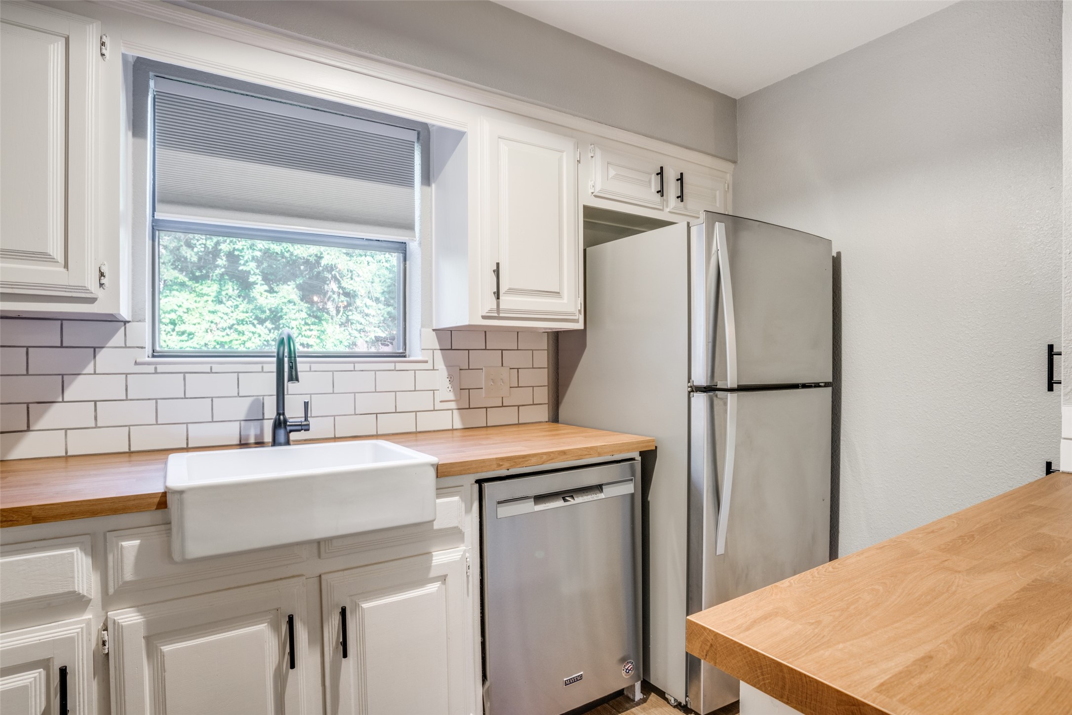 Charming townhome available for rent on a quiet cul-de-sac in the heart of McKinney. This two-story house has modern updates throughout. The first level has a cozy living space with a wood burning fireplace, laminate flooring, a dining area, a half bath for guests, a laundry nook and a kitchen with butcher block countertops, a farmhouse sink and modern stainless steel appliances. Upstairs, you will find two generously sized bedrooms with walk-in closets and a full bath. Don't miss the backyard with mature trees offering complete privacy. Conveniently located with easy access to Central Expressway, McKinney's downtown historic square with fabulous restaurants and shopping and much more. Refrigerator and Washer & Dryer Stay!